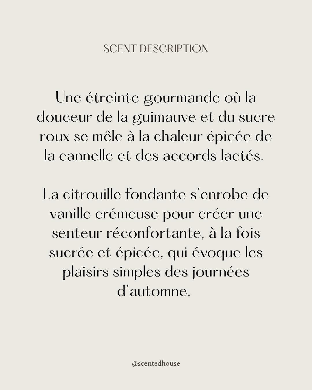 Une étreinte gourmande où la douceur de la guimauve et du sucre roux se mêle à la chaleur épicée de la cannelle et des accords lactés. La citrouille fondante s’enrobe de vanille crémeuse pour créer une senteur réconfortante, à la fois sucrée et épicée, qui évoque les plaisirs simples des journées d’automne.
