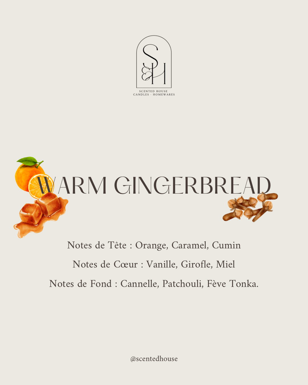 Un parfum chaleureux et épicé qui mêle gingembre, cannelle et vanille, rappelant le pain d’épices encore tiède, tout juste sorti du four. Gourmandise et cocooning en un seul souffle.