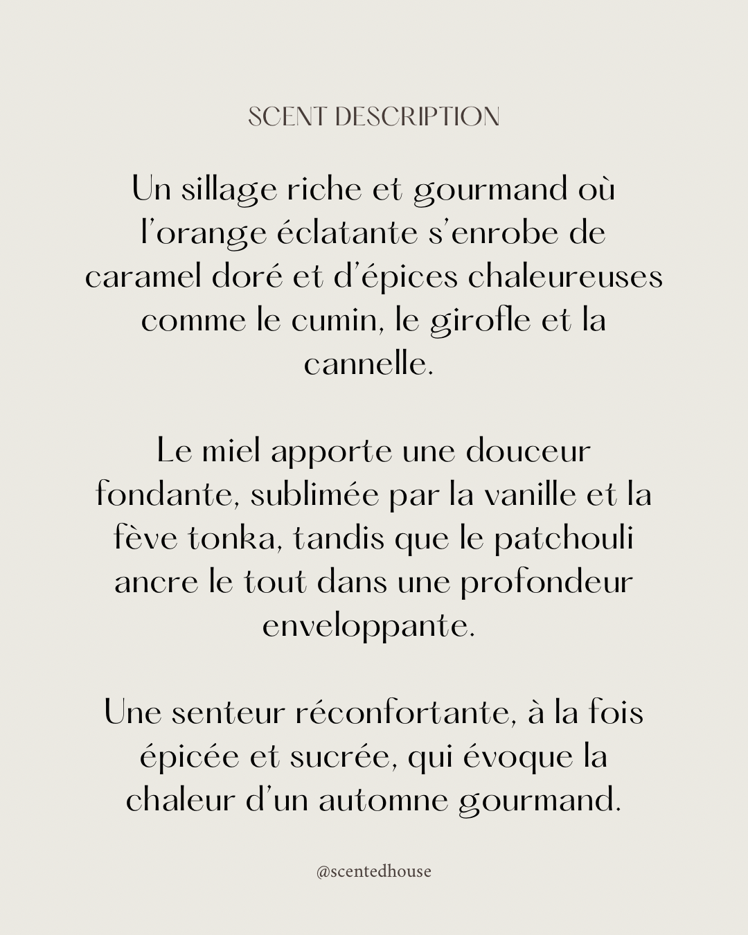 Orange . Caramel . Cumin . Vanille . Girofle . Miel .